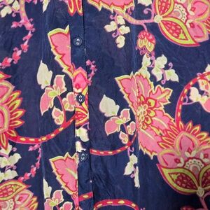 SILK SILK SILK. ......Johnny was light silk print button down front 3/4 sleeve top. great as a top or a beach coverup. Even better with a skirt and a belt. Lightly used and washed by hand once.