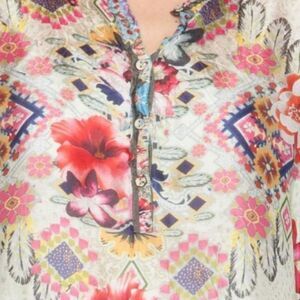 Johnny Was size small Elegant floral beige top with vibrant patterns. Major floral color is pink. Lightweight boho style. Can wear casual or dressed up. Oversized. Comfort style tunic. Perfect for any occasion. Pre-loved great condition. Extra button included.