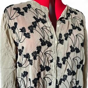 Johnny Was Tan/Khaki Button Up Shirt Blouse With Black Embroidered Flowers