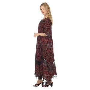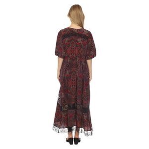 Features a V neckline, short sleeves, elastic waist, lace insert panel, pull on style, paisley, 100% silk, midi, unlined, in red multi