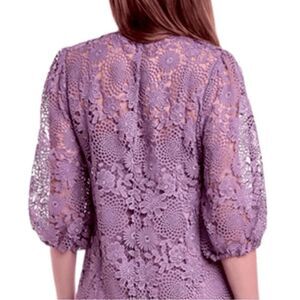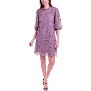 Beautiful Johnny Was Lorrie Mini Dress in soft lavender purple with exquisite crocheted floral lace. Features puff elbow-length sleeves, mock neckline, and keyhole back. Includes detachable under slip.