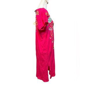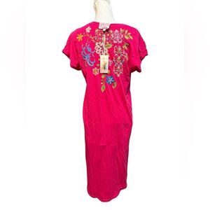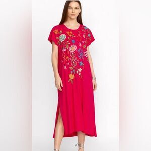 Johnny Was Size Small Hot Pink Floral Embroidered SHERI RELAXED KNIT DRESS, Cotton Flower Bird Long Tshirt Dress. Crafted from 100% cotton knit, the Sheri Relaxed Knit Dress is a fresh take on a classic t-shirt dress. Featuring a rounded neckline and capped raglan sleeves, this relaxed-fit dress offers side slits and vibrant placement embroidery at the front and back. Pair with fashion sneakers and a casual tote for a polished weekend vibe.