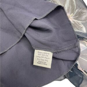 Your favorite baby doll dress returns in a sophisticated update. Deep V-neckline offset by a row of ruffles calls attention to the new grown-up you. The black underlay conforms to your body, while a filmy layer of lavender and pale blue flowers swirl over this masterpiece.