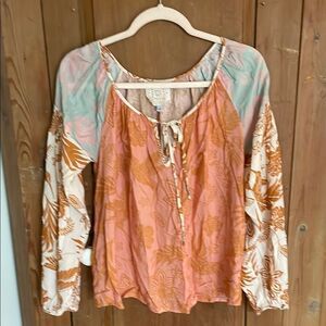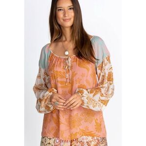 Johnny Was pheasant top in mixed floral pattern print and long sleeves with elastic cuff. Front tie and keyhole opening. Excellent condition