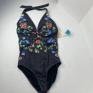 Johnny Was one-piece twist-front swimsuit in back with geo circle print background and bright floral print. Halter tie in back with padded cups. NWT made of nylon and elastane.