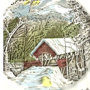 This Vintage Johnson Brothers Friendly Village The Covered Bridge Plate is 1" H x 10.5" in diameter and is in very good to excellent condition. We invite you to look at the variety of other Friendly Village Pieces we have available in our store-please message us with any questions-if you want to bundle a number of pieces together, we will combine shipping and negotiate special pricing! Make this yours today! #4037