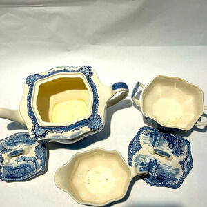 Johnson Bros Old Britain Castles 1792 Tea Set. Includes Tea Pot, Sugar Bowl and Creamer. Slight staining inside (see pictures). Tea pot has small chip on the spout (see picture). Good Condition, Used.
