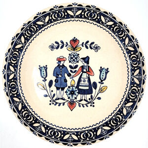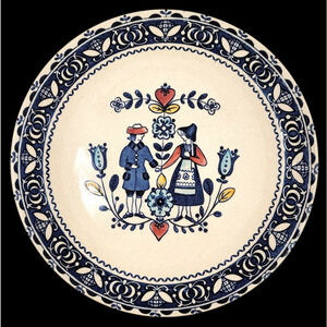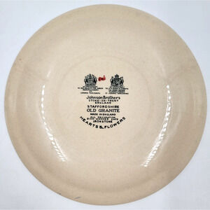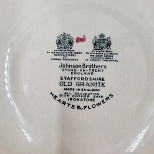 Johnson Brothers Hearts & Flowers Staffordshire Old Granite salad plate. Made in England. White ironstone with blue folk-art border and heart & flower center. Black backstamp. Classic country / farmhouse look.