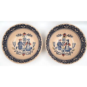 Johnson Brothers Hearts & Flowers Staffordshire Old Granite cereal bowls. Made in England. Beige ironstone with blue folk-art border and heart & flower motif. Dishwasher safe ironstone. Color is a beige or cream