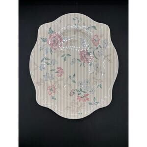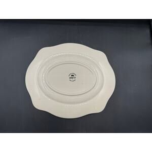 Vintage Johnson Brothers Lynton Oval Platter (11-3/4") featuring pink and blue flowers on a scalloped rim. Made in England and dishwasher/microwave safe, this retired pattern (1989–1991) is in good condition with no chips, cracks, or crazing. The glaze remains bright with only minimal utensil marks from over 30 years of use—a beautiful, collectible piece. Great value!!