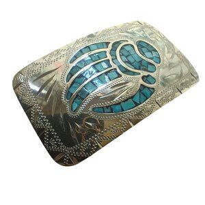 This exquisite vintage belt buckle is a testament to masterful craftsmanship, featuring a striking turquoise inlay design on a silver base. The intricate detailing provides a unique aesthetic, reflecting a blend of traditional and artistic influences from an era gone by, capturing the essence of cultural heritage and style.