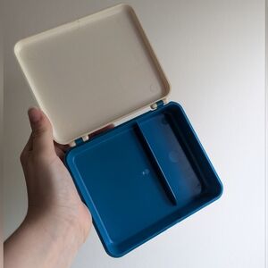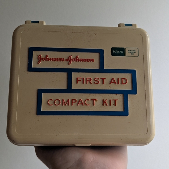 Vintage 1967 Johnson & Johnson first aid compact kit in tan with red and blue accents. Excellent vintage condition.