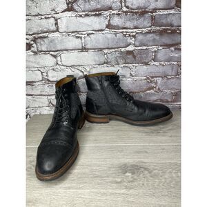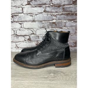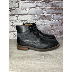 The Johnson & Murphy 1850 Brogue Cap Toe Side Zip Lug Sole Tweed Ankle Boots in men's size 9.5 are a stylish and versatile choice for casual, formal, workwear, or business occasions. These black leather boots with almond toe shape and lace-up closure feature a side zip for easy wear. They are lined, slip-resistant, and insulated, making them suitable for winter, fall, and spring seasons. The classic design with tweed pattern and adjustable features make them a timeless addition to any wardrobe, perfect for those who appreciate a blend of traditional and modern styles.