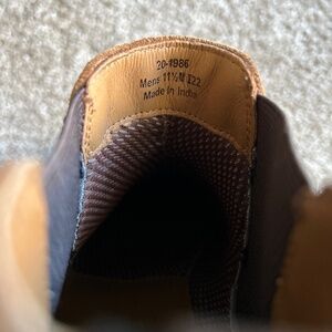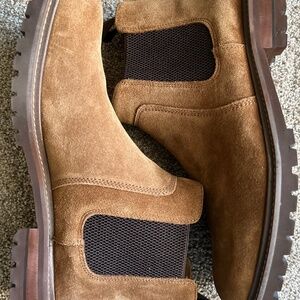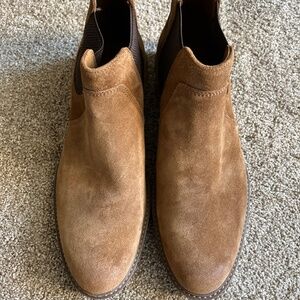 Stylish brown suede Chelsea boots. Elastic side panels. Durable sole. Perfect for casual wear. Lightly worm.