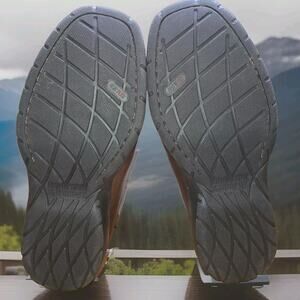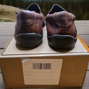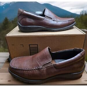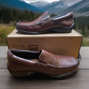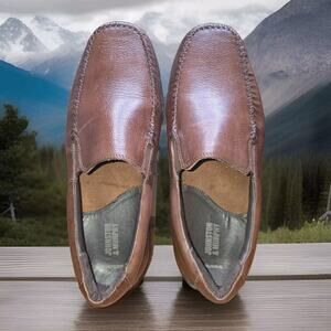 The product is the Johnston & Murphy Crawford Venetian Men's Slip on in brown, size 8.5. These dress shoes feature a slip-on style with an Oxford design, made of leather. The shoes are branded under Johnston & Murphy, known for their quality and classic styles. The shoes come in a replacement box, making them a great option for those looking for a stylish and convenient pair of dress shoes.