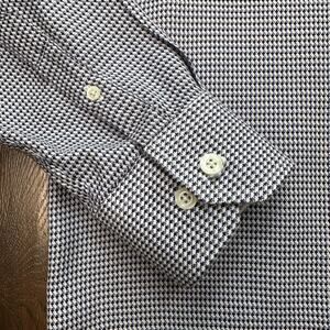 Johnston & Murphy Dress Shirt Men’s Size L – Blue, Brown, and White Textured Pattern, Classic Button-Up Front, Point Collar, Long Sleeves with Flip Cuff Detail, Premium Woven Fabric, Tailored Modern Fit, Clean and Polished Silhouette, Comfortable and Refined Construction, Perfect for Office Wear, Business-Casual Outfits, or Sophisticated Evening Styling.