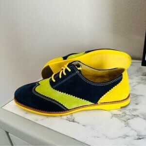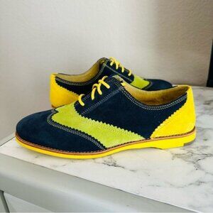 Trendy navy and yellow suede oxfords with a vibrant design. Perfect for adding a pop of color to any outfit.