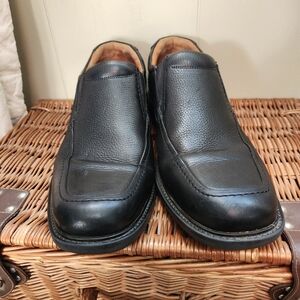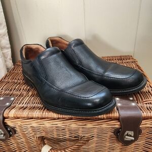 Step into sophisticated comfort and weather-defying performance with these modern Johnson & Murphy black leather slip-on loafers, men's size 12.