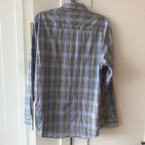 Blue, tan, dark gray and white plaid men’s button down shirt. Size M. Runs a bit large, measurements are on last image. Great condition.