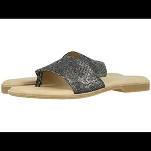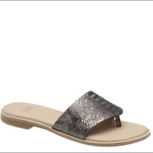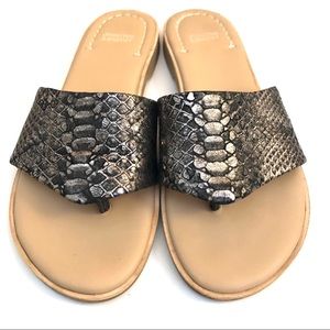 Johnston & Murphy Raney Sandal in Black Metallic Snake-Print Leather. Minimalist toe-post sandal in luxe Italian leather. Sheepskin lining. Cushioned footbed. Rubber sole. In excellent condition! Practically new. Worn one time! Very cute and comfortable. Doesn’t come with box.