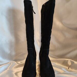 Johnston & Murphy "Rebecca" Black Suede, Tall Boot. Round toe. Size 8.5. 3 1/2" covered, wedge heel. Full length inside zipper with tassel detail. Man made, soft lining. New, never worn.