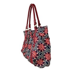 Colors are Dark red, navy and cream with light sage dots. Great bag for everyday carry, vacay, or a fun weekend away. Beautiful colorful bag.