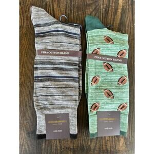 1 pair of pineapple socks, 1 pair navy argyle combed cotton, 1 pair gray striped, 1 pair denim blue cat patterned, 1 pair green football socks, a pair navy pima cotton. Pictures show exact fabric details.