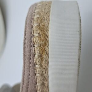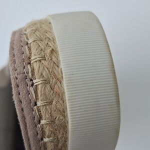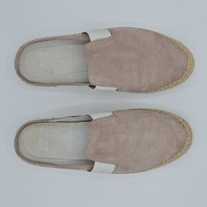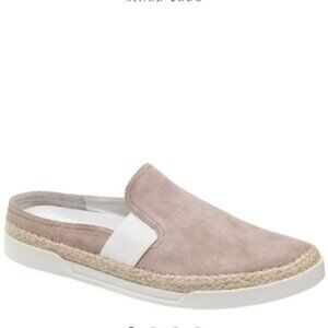 Espadrille-style Italian suede mule with sporty details, cushioned comfort. Removable leather/textile-covered cushioned insole.