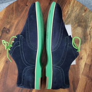 These unique wingtip derbies feature a blue suede upper with bright green leather lining and laces, cushioned footbed and non-marking leather outsole.