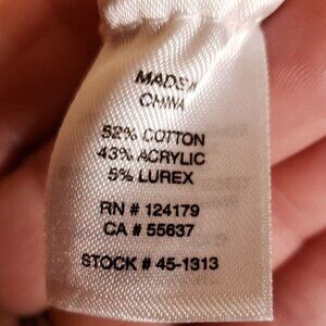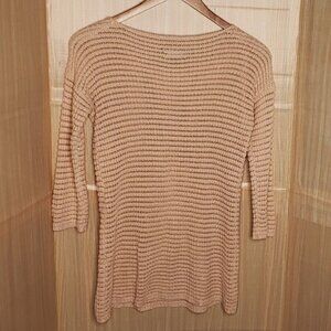 Johnston & Murphy womens’s wide neck peach pink textured open knit ¾ sleeve tunic sweater with sparkle medium. Gently used condiiton. Measurements are: 16” drop sleeve, 29 ½" from shoulder to hem, and 22 ½” from armpit to armpit.