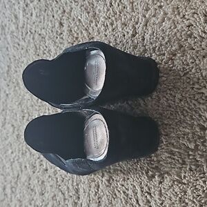 Black Suede wedge mules, size 8, good condition, worn less than 5x