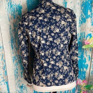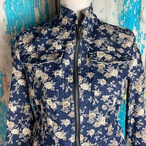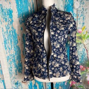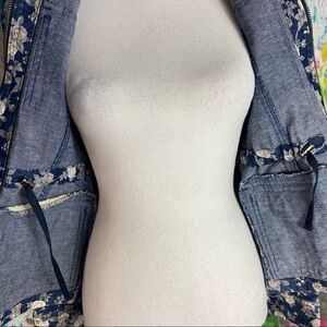 euc, floral denim fitted jacket and has a drawstring in the inside to accentuate the waist.