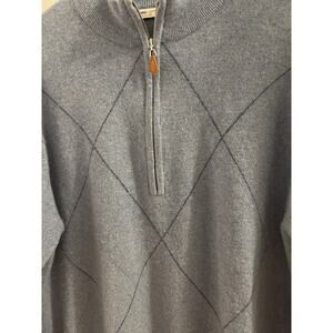 The Johnstons Cashmere Blue Mock Neck 1/2 Zip Cashmere Sweater in size M is a luxurious and classic piece of men's clothing, perfect for various occasions such as travel, parties, casual outings, workwear, and business meetings. Made in Scotland by the renowned brand Johnstons of Elgin, this sweater features a tight-knit argyle/diamond pattern in a beautiful blue color. The mock neck and long sleeves provide warmth and style, making it a versatile garment for the winter, fall, and spring seasons. Ideal for those who appreciate high-quality cashmere and a preppy yet timeless look.