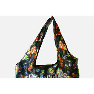 This Johny Was California reusable shopping bag/tote is perfect for those who love contemporary style. The bag features a beautiful birds and floral pattern on a black nylon material. The item measures 18" side-to-side (laying flat) and has a height of 24". The bag is packable and foldable, making it perfect for on-the-go shopping. The tote comes with a packable pouch attached, making it easy to store your items. The bag is hand wash only and has a width of 12" depth edge-of-strap to edge-of-strap at sides. This bag is great for anyone who wants a stylish and practical option for shopping.