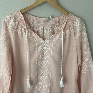 Joie 100% Linen Embroidered Peasant Top Pink White Embroidered Boho