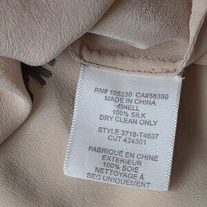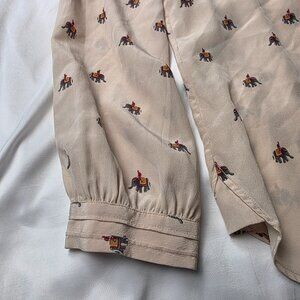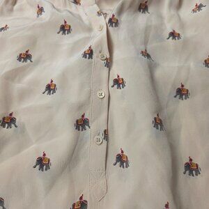 Beautiful Joie 100% silk blouse featuring an all-over elephant print in soft beige with subtle multicolor detailing. Long sleeves with button cuffs and partial button-down front. Relaxed fit with lightweight, luxurious silk fabric — perfect for both work or weekend wear.