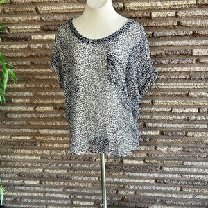 Joie 100% Silk Black White Animal Print Sheer Short Sleeve Blouse Size Small