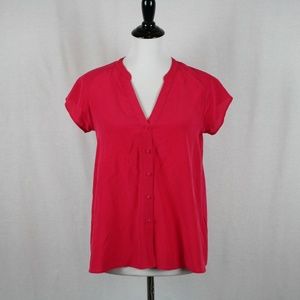 This color is so pretty!! 100% silk top has short sleeves. V neck with a completely button up front. Size is an XS but runs really big. Fabric is so lovely and feels awesome. Perfect for Spring!!