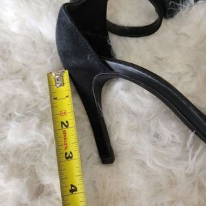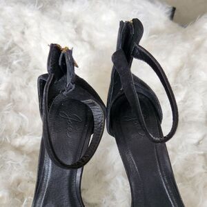 black suede heels with gold zip hardware in back. ankle strap. Preloved condition. All sections of interest as well any known flaws have been documented in the photos and noted as thoroughly as possible. if there are no known flaws, none will be noted. Please feel free to ask any questions before purchase 🙂. Please see photos for measurements shown. heel is approximately 4 inches per manufacturer. sold out on revolve