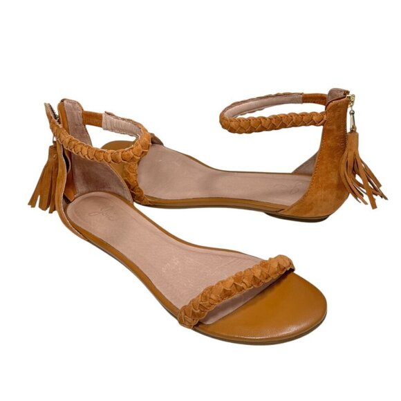 Joie Amina Suede Tassel Braided Sandals sz 7.5 Caramel Brown Zip Back Flat