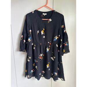 Joie Avari Silk Boho Baby Doll Dress Black Floral Print Mini Bell Sleeves SZ SM