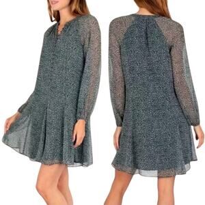 Joie Balloon Sleeve Mini Swing Dress Button Front Animal Dot Print Dark Green