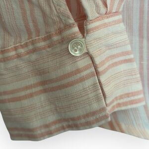 Joie Bekette top is lightweight striped blouse in soft pink and white. Split V-neck, button-down front, and long sleeves with subtle balloon cuff detail. Relaxed fit, casual and chic. Perfect with jeans, skirt, or layered under a blazer.