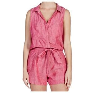 Joie Belted Linen Romper Toinette Pink Cutout Back Pockets Chambray Shorts S