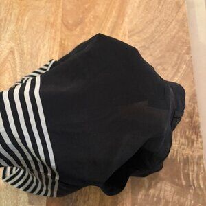 Silk shorts, black with black and white stripes on edge. Mid to low rise. Slightly transparent, as seen from the photo where I put my hand on the other side. Never worn