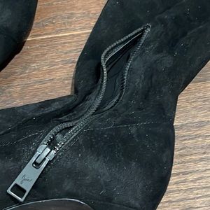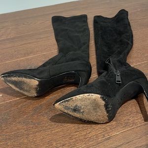 Elegant black over the knee heeled boots. Sleek and stylish design. Perfect for any occasion. Runs small.