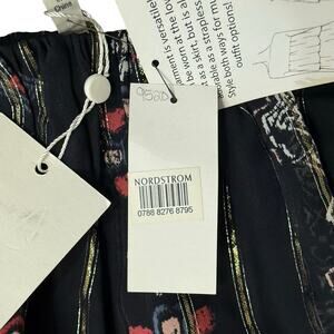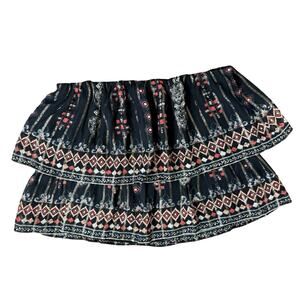 This convertible Joie Lyane silk piece can be worn as a tiered mini skirt or a strapless top for versatile boho-chic styling. Features a smocked elastic waistband for comfort and a flouncy, layered silhouette that moves beautifully. Crafted from 96% silk and 4% metallic fibers, the fabric shimmers subtly under light with a black, pink, and white paisley print. Perfect for summer days, festivals, or beach vacations. Originally retailed for $285. RN 105230 CA 58350.