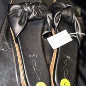 Experience the perfect blend of style and comfort with Joie's black sandals, featuring a striking satin bow. These slip-on sandals boast a flat sole with a subtle tan edge, making them ideal for both casual outings and dressy occasions.