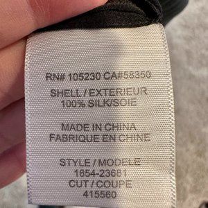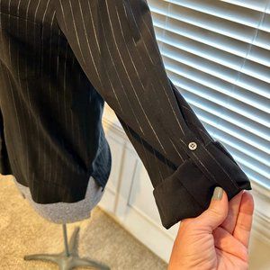 Silk tunic with light silver pinstriping. Button front, tab button sleeves.
