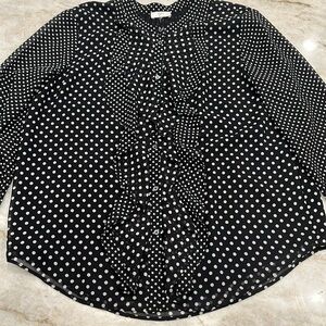 Elegant and romantic Joie “Darek” blouse in classic black with white polka dots. Collarless design with a ruffled front placket and long ruffled cuffs. Sheer sleeves add a delicate touch. Lightweight 100% polyester. Size tag is missing, but measures as a Large — please check measurements for best fit. Excellent preowned condition, no flaws, like new.